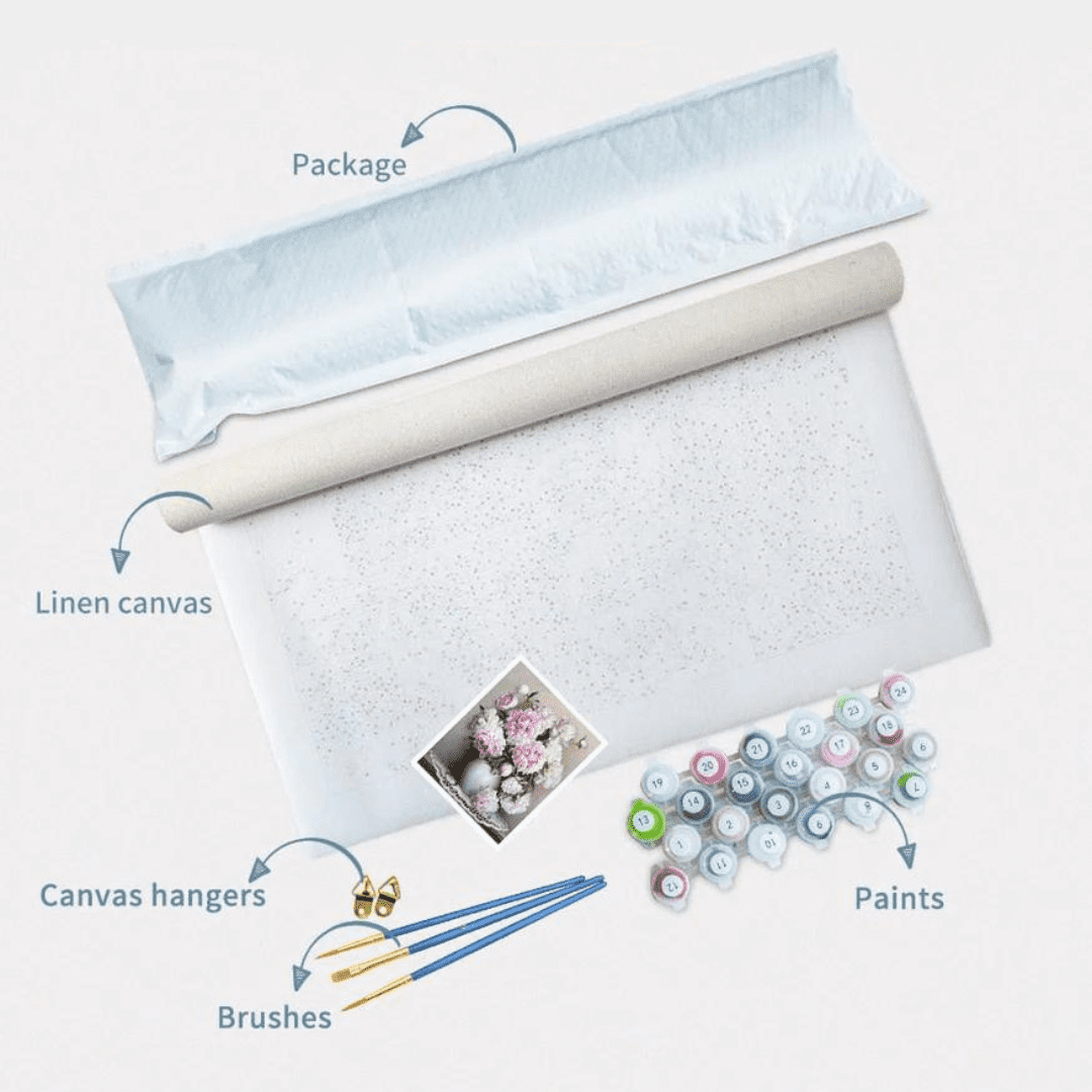 To create your masterpice, simply match the numbered acrylic paint pots with the number printed on the canvas.