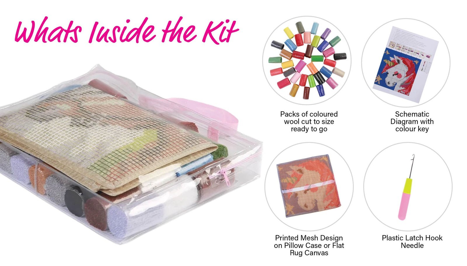 Start a new arts and craft hobby with our range of rug making kits and latch hook pillow making kits. Available in a range of stunning designs and different sizes these latch hook kits come with everything you need to make your own shag pile rug or pillow.